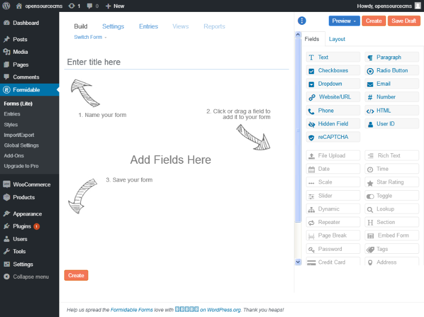 探索设置安装 Formidable Forms 插件后,它将在左侧边栏中添加一个链接。让我们简要浏览一下每个部分。