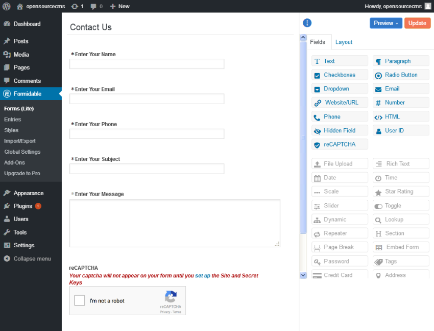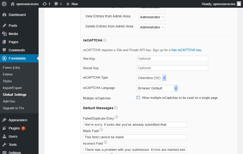 最后,添加一个 reCAPTCHA 字段以防止垃圾邮件。要启用reCAPTCHA垃圾邮件防护,您需要在强大的>全局设置> reCAPTCHA部分下配置站点密钥和秘密密钥,如下所示以下截图。