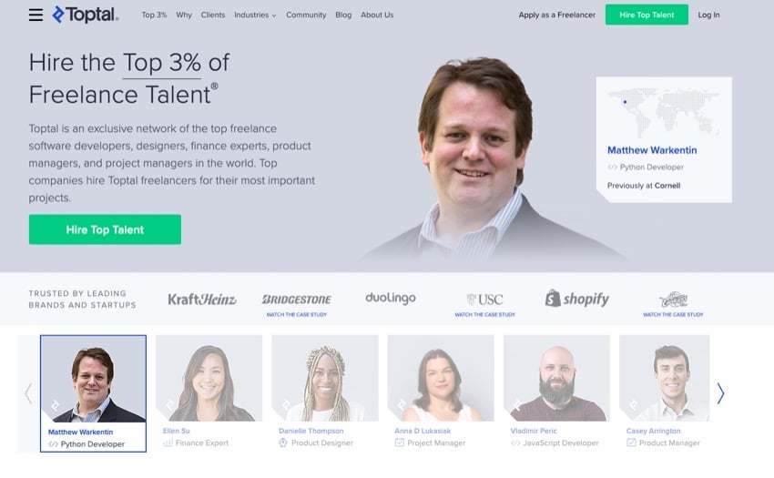 Toptal 是寻找和雇用高技能 WordPress 网页设计师的最佳场所之一。该平台以其严格的技能评估流程而闻名。只有前 3% 的自由职业人才被接受为其网络的一部分。