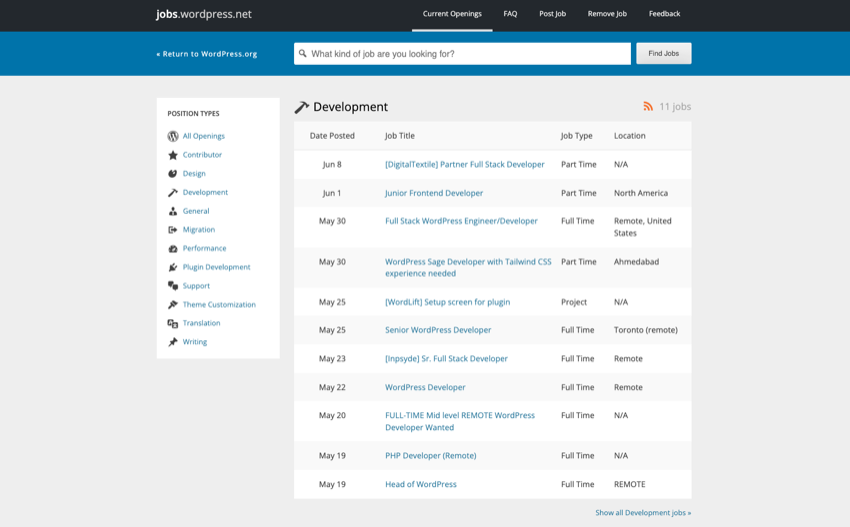 WordPress Jobs 是一个适合 WordPress 网页设计和开发的职位列表页面。对于希望聘请熟练 WordPress 开发人员的企业来说,这是一个极好的来源。